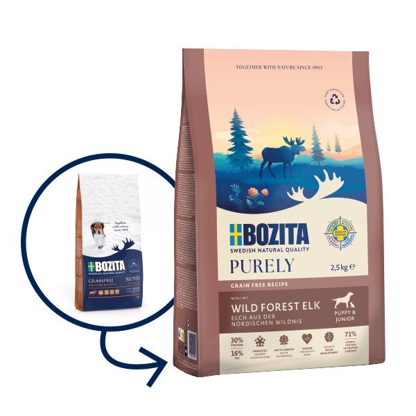 Zawiera smaczne, świeżo przygotowane łosie i kurczaki, a także jaja, które zawierają wartościowe białka, szczególnie ważne dla szczeniąt. Z prebiotycznym FOS, aby promować dobrą funkcjonalną florę bakteryjną jelit. Wielkość krokietów jest odpowiednia dla wszystkich ras.